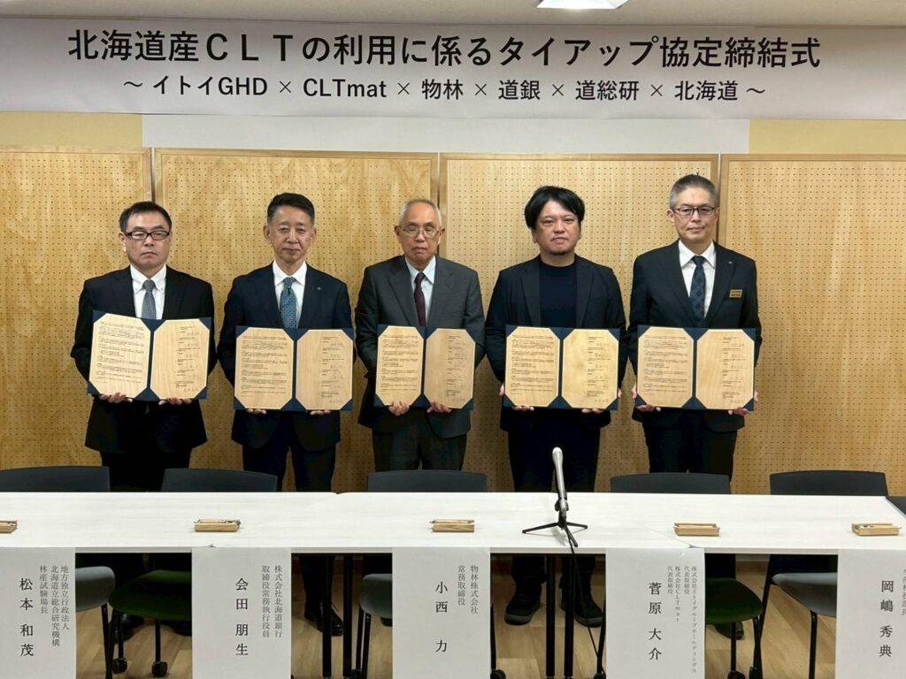 2026年2月9日にイトイグループホールディングス、株式会社CLTmat、北海道、株式会社北海道銀行、地方独立行政法人北海道立総合研究機構、物林株式会社の6者が、ゼロカーボン北海道と持続可能な社会の実現に向けて、土木分野、建築分野での用途拡大が期待され、炭素を長期間固定する木製品である道産CLT利用が進むよう、相互に連携・協力しながら協働事業に取り組むこととして、「CLT利用に係るタイアップに関する協定」を締結したことをお知らせいたします。
